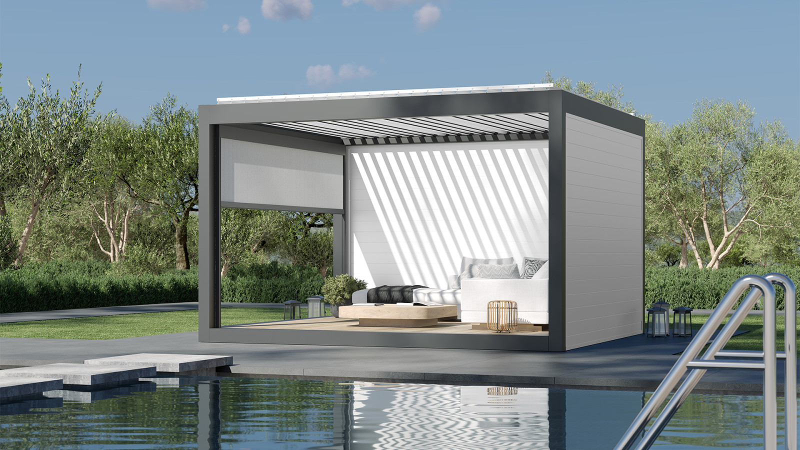 Aluwall, a versatile system featuring panels set within a sturdy aluminum frame, is designed not only to enclose the sides of our pergola systems but also to create elegant interior & outdoor partitions.